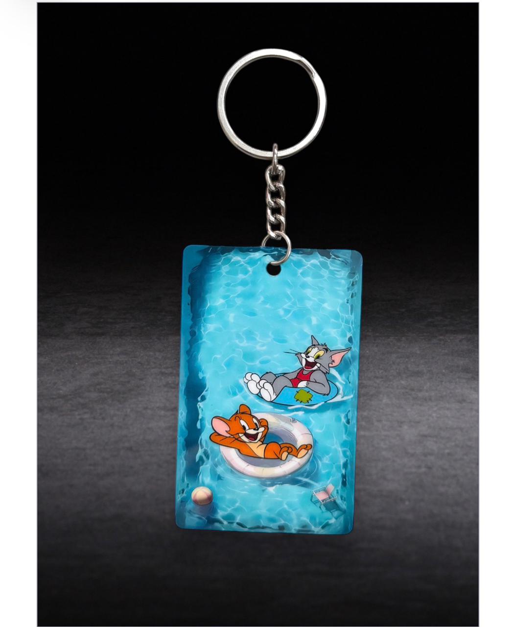This unique keychain showcases Tom and Jerry floating peacefully in a miniature pool scene, beautifully encased in translucent blue resin with a textured finish. A perfect blend of childhood memories and summer vibes.